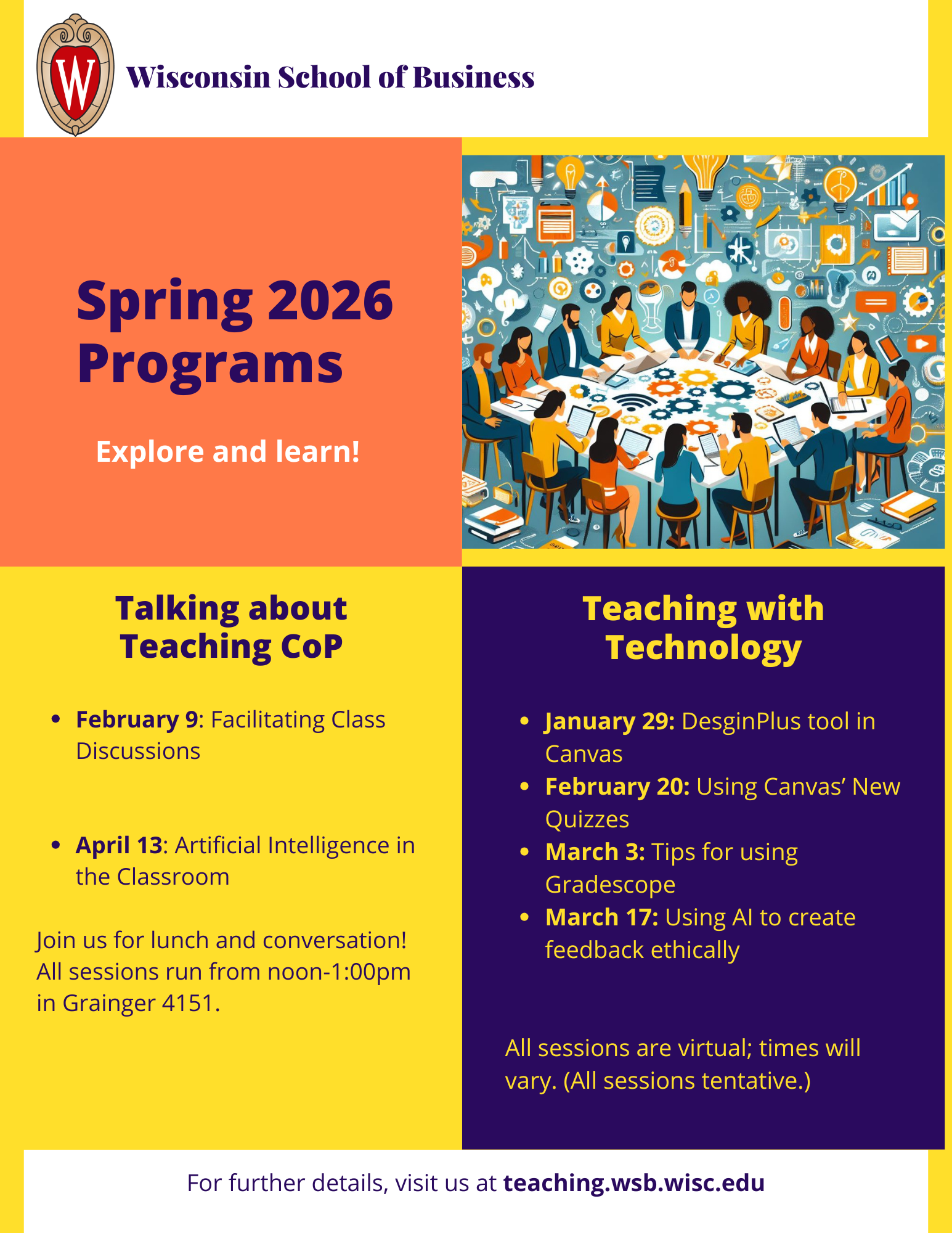 During the Spring 2026 semester we will have faculty and instructors from across WSB share their tips and tricks on the topics below. All Talking about Teaching meetings will be located in Grainger 4151 from 12:00pm-1:00pm. Light refreshments will be served at noon and the program will start at 12:15pm.